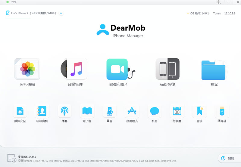 • DearMob iPhone Manager 對於 iOS 裝置備份、恢復或換機來說的確是一個很大的助手,它的功能要比 iTunes 強大的多,支援 iOS 裝置多達 15 種檔案類型、超快的檔案資料備份和傳輸速度、支援檔案加密與鈴聲製作等超多實用功能。